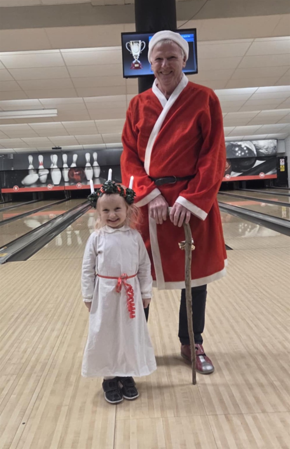 ....vad betyder nu detta?! Jo i år hade julkommittén bestämt att ALLA skulle spela med staketen uppfällda på banorna och första serien skulle genomföras med felaktig hand och serie två med båda händerna. Några rutor var utmärkta som "stjärnsmällar" och då gällde det att antigen spärra eller slå en strike i dessa rutor för att få hämta en julklapp🎁i pakethögen, vilket inte var det lättaste trots hjälp av staketen🙈som tur var hade vi en liten och stor lucia som med jämna mellanrum plingade i bjällran och då gällde det för ALLA att vara snabb till pakethögen.